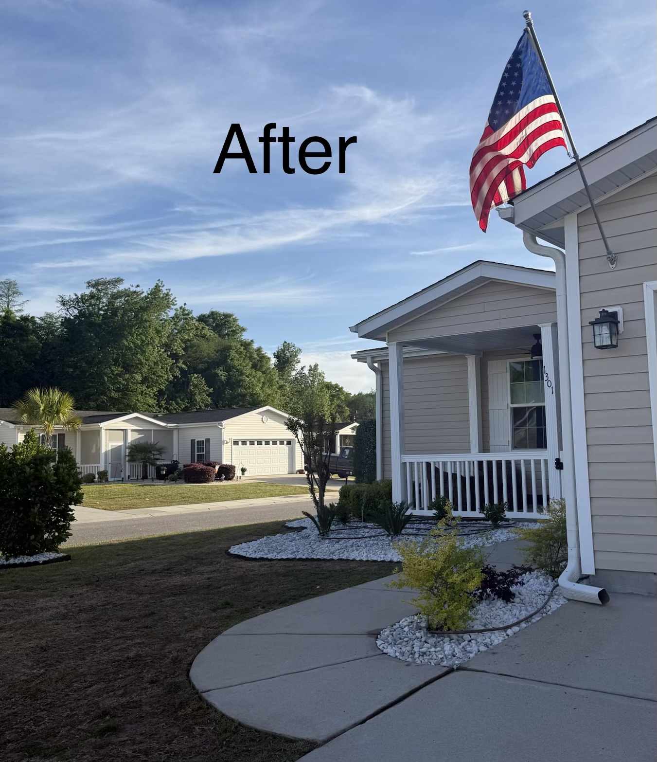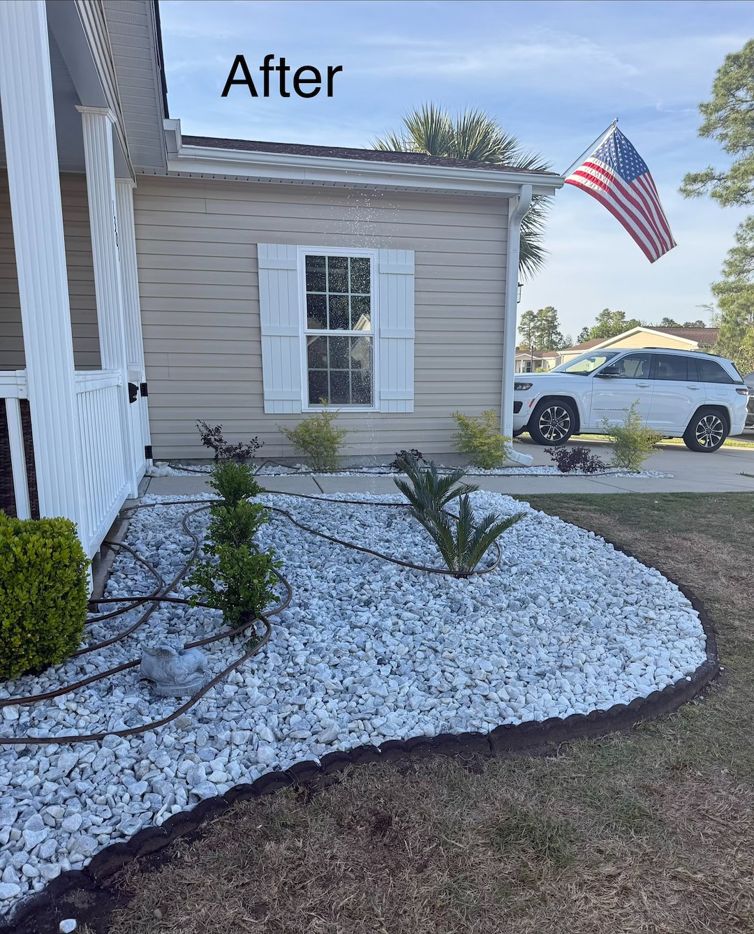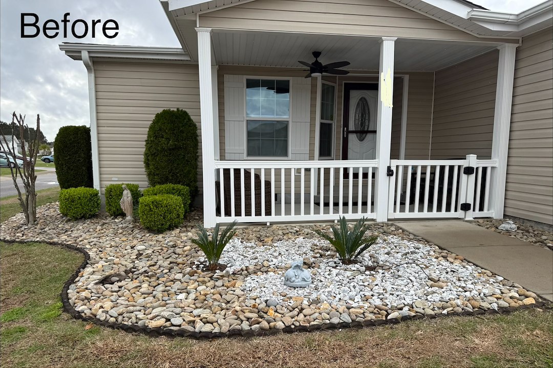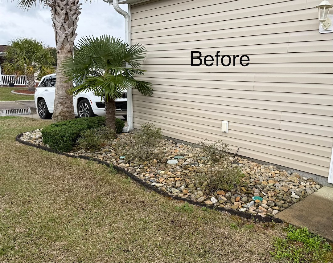This rock and plant installation project was done around the first week of April 2026 near Carolina Forest in South Carolina. The existing big rocks in the landscaping beds were removed and replaced with White Marble 2"x1" stone. We relocated the Arborvitae tree from the front left landscaping bed to the left side of the house next to the other Arborvitae tree. In the front landscaping bed and the bed along the walkway a Sago Palm tree, Japanese Hollies, Sunshine Ligustrums, and Cerrice Charm Loropetalums were installed among the existing shrubs.