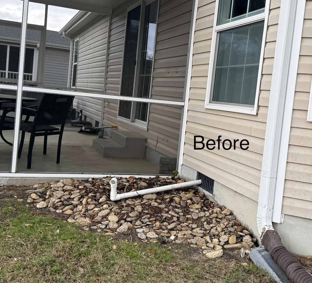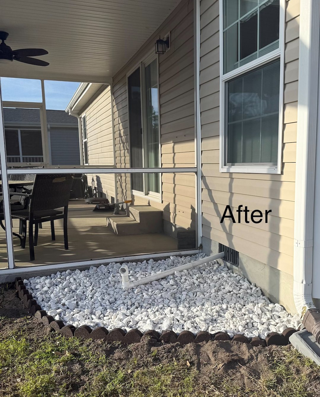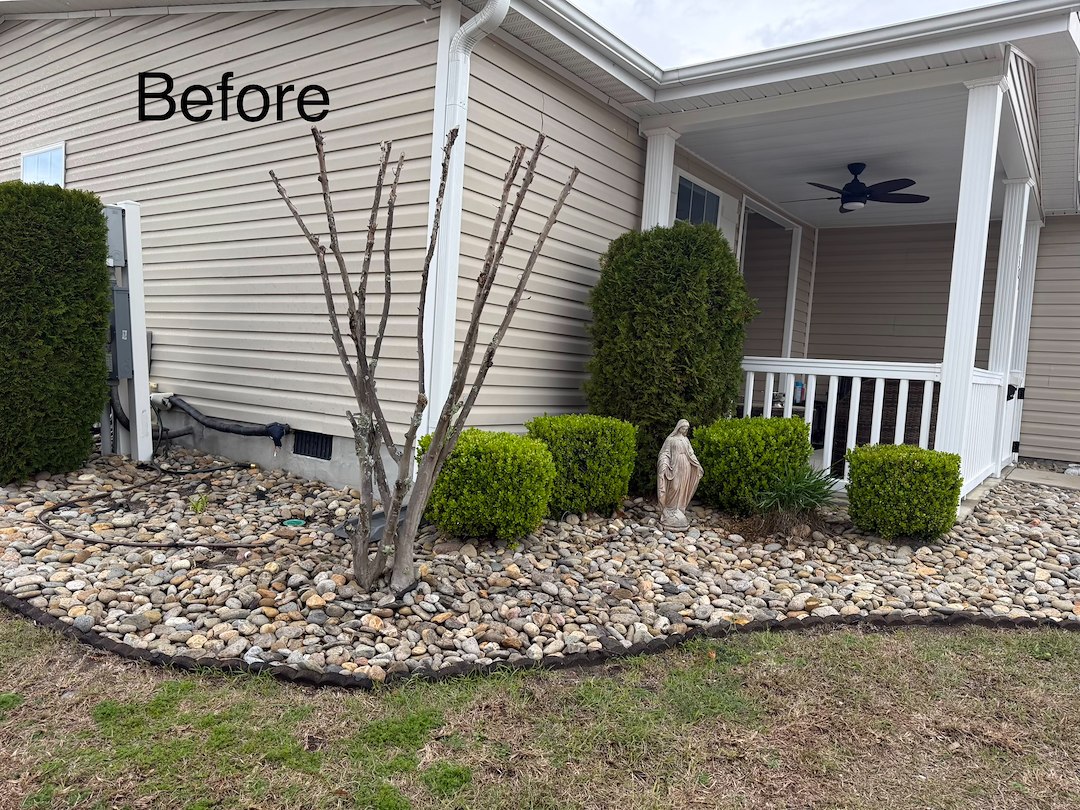 This rock and plant installation project was done around the first week of April 2026 near Carolina Forest in South Carolina. The existing big rocks in the landscaping beds were removed and replaced with White Marble 2"x1" stone. We relocated the Arborvitae tree from the front left landscaping bed to the left side of the house next to the other Arborvitae tree. In the front landscaping bed and the bed along the walkway a Sago Palm tree, Japanese Hollies, Sunshine Ligustrums, and Cerrice Charm Loropetalums were installed among the existing shrubs.