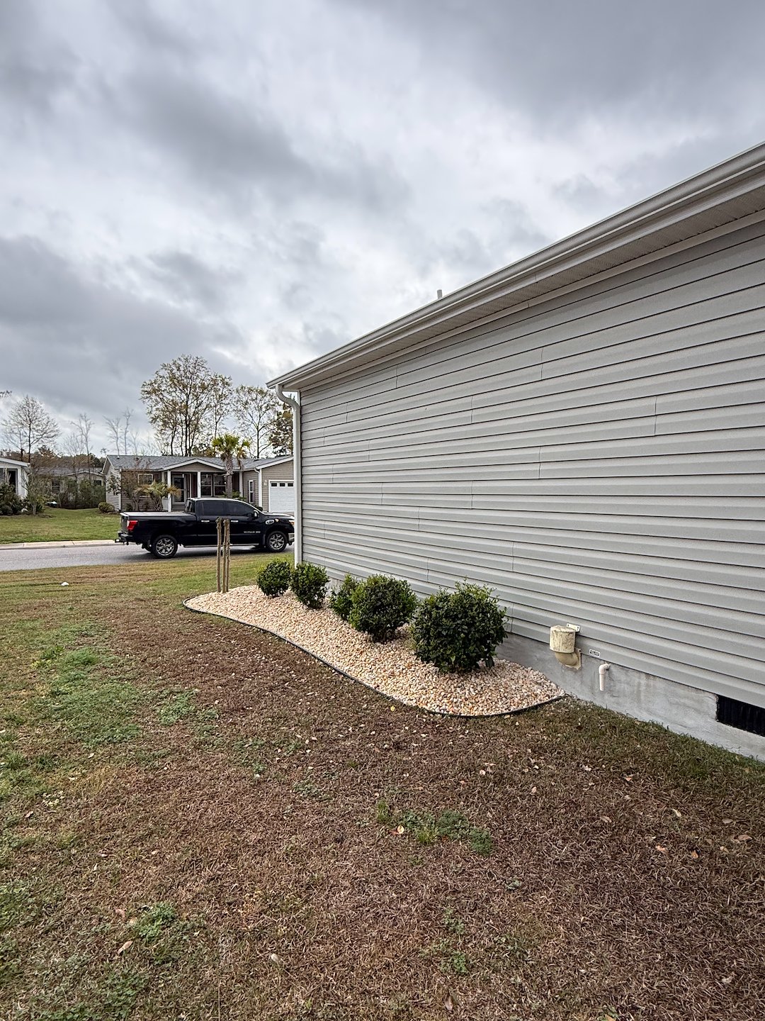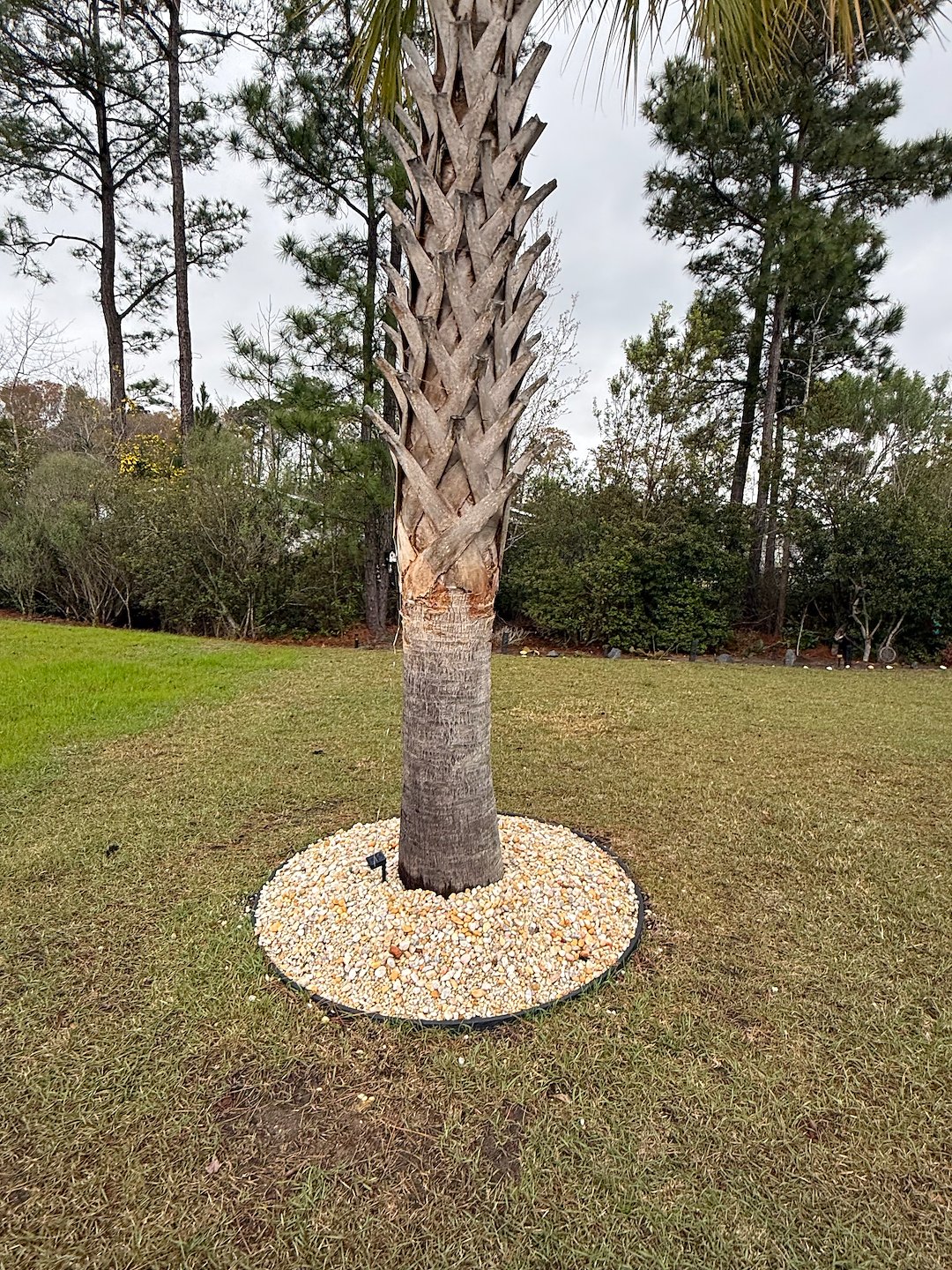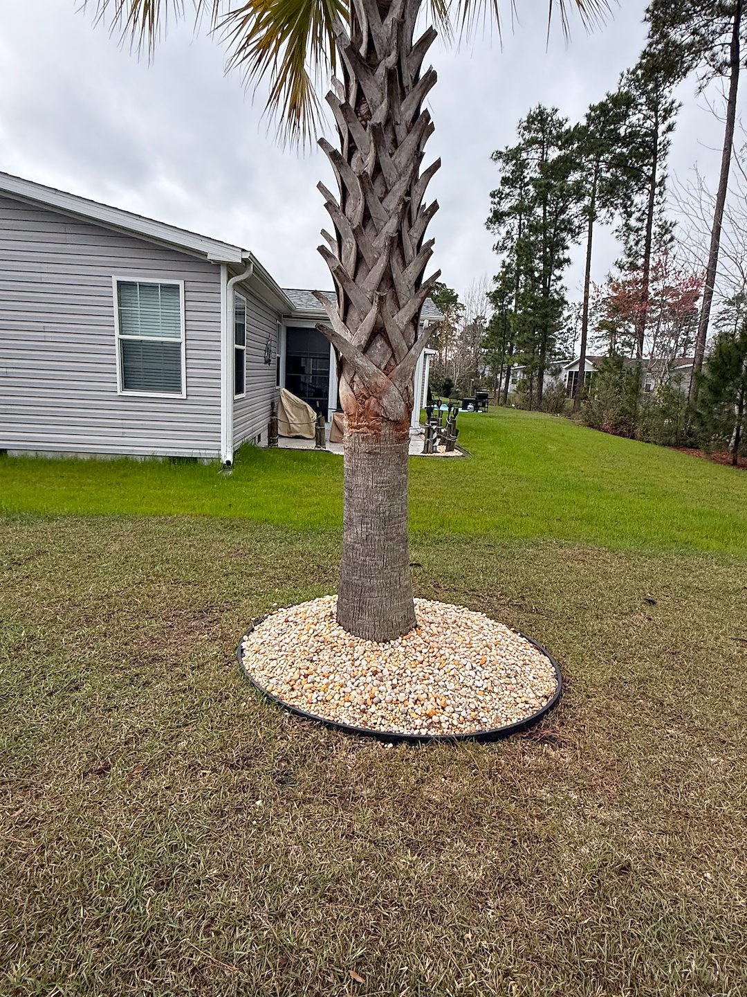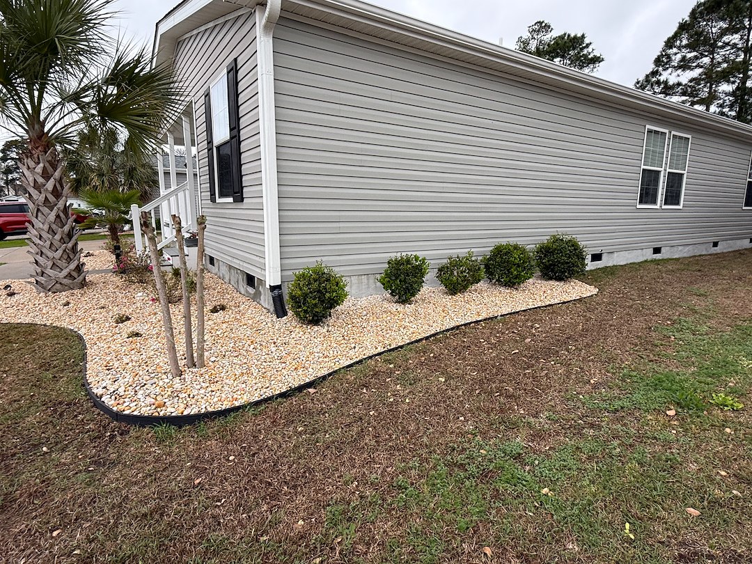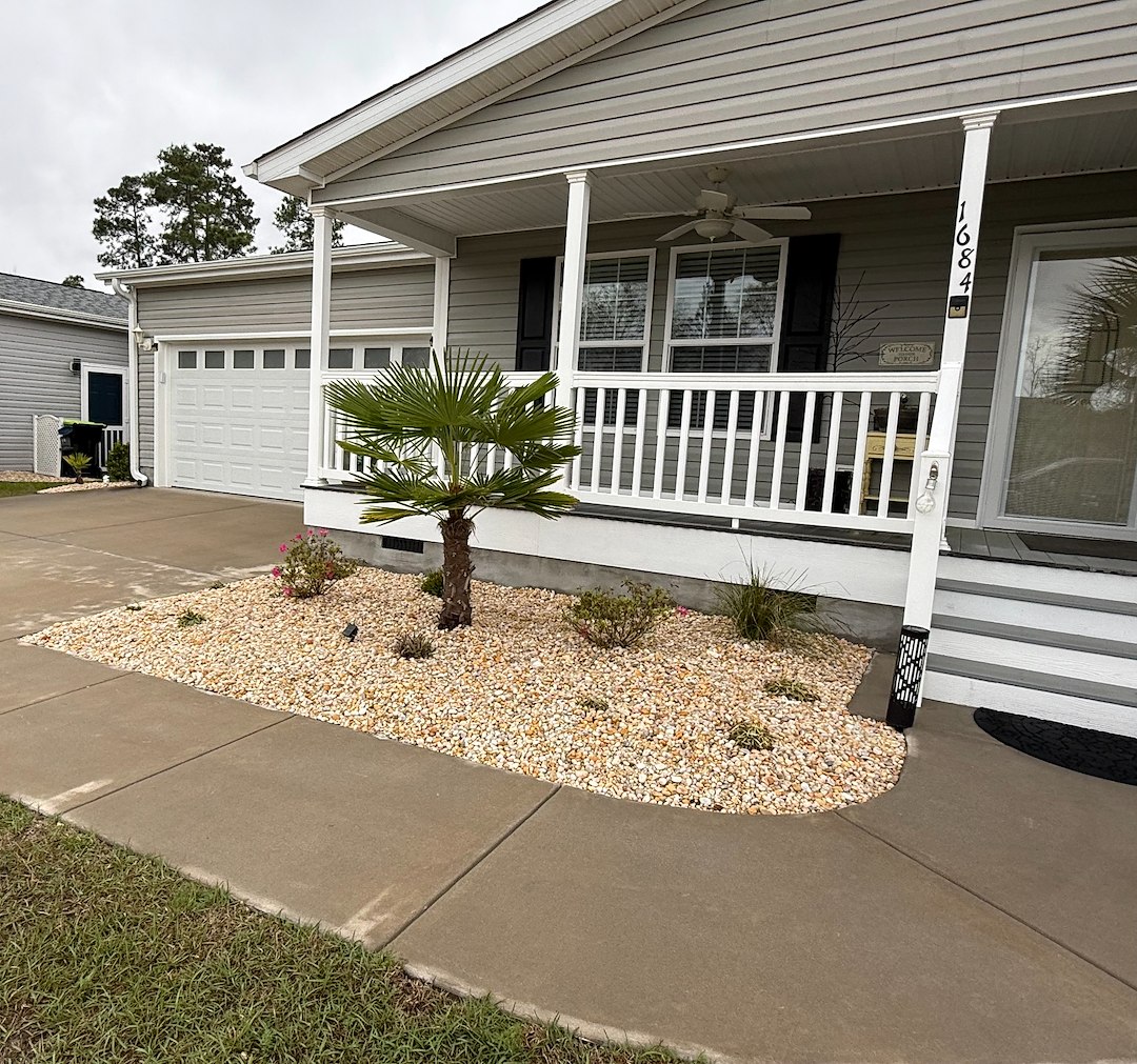 These are two rock installation jobs we completed around mid March 2026 in Conway, South Carolina. The existing rocks in the landscaping beds in front of the house were removed and replaced with a different style of rocks. We created new landscaping beds around the palm trees, put down plastic, and installed new rocks.