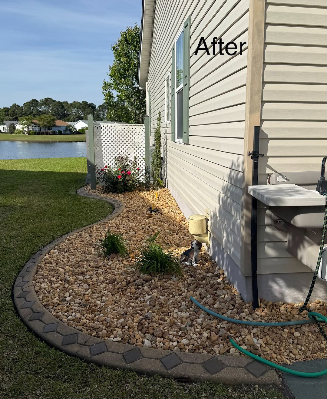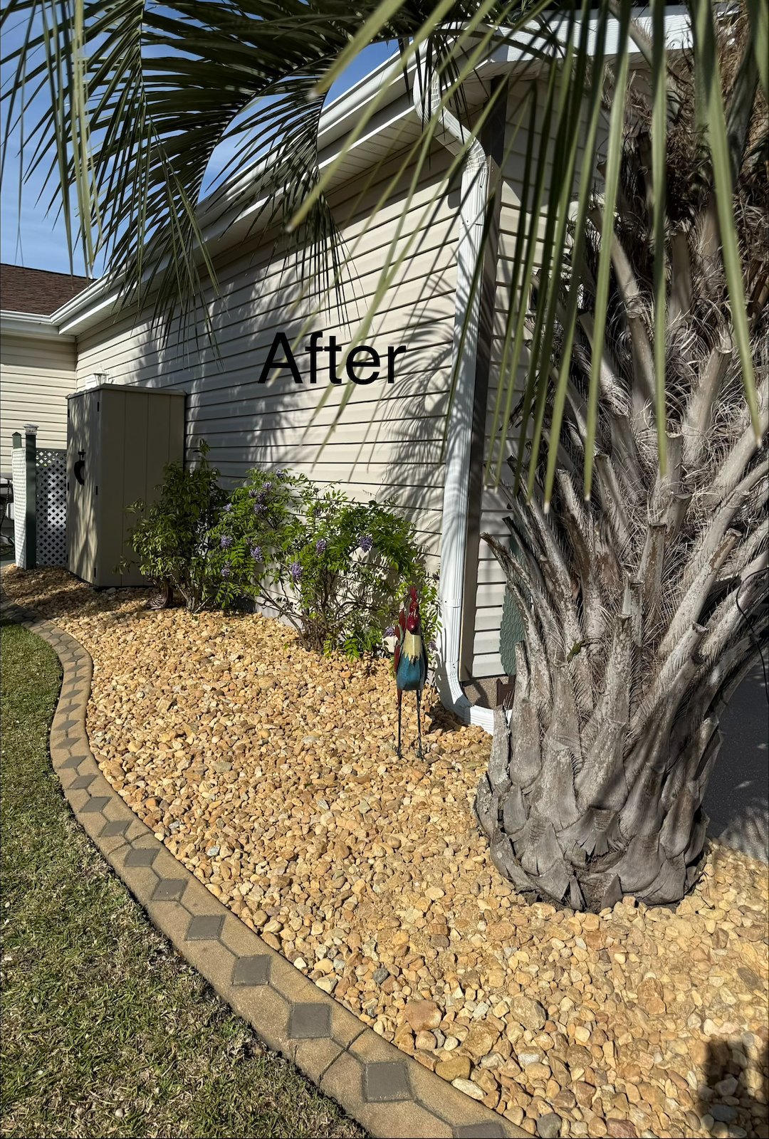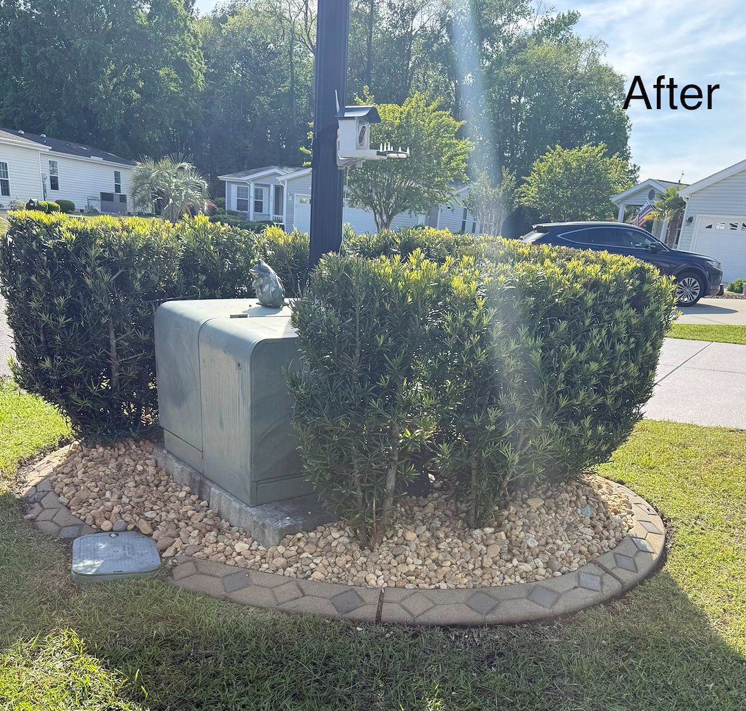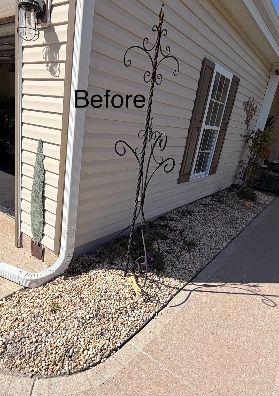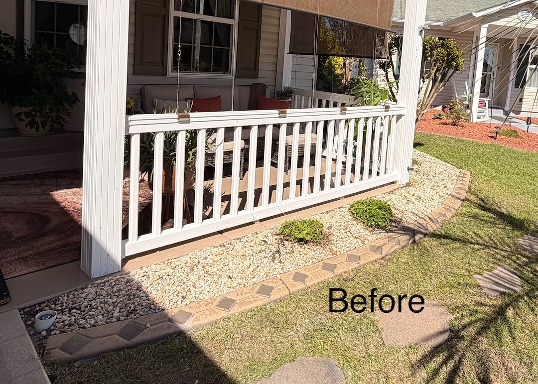 This job was completed around the second week of April 2026. The landscaping beds had existing small light colored rocks which were removed and replaced with darker and bigger rocks that matched the border of the landscaping beds. A few shrubs were relocated in the beds.