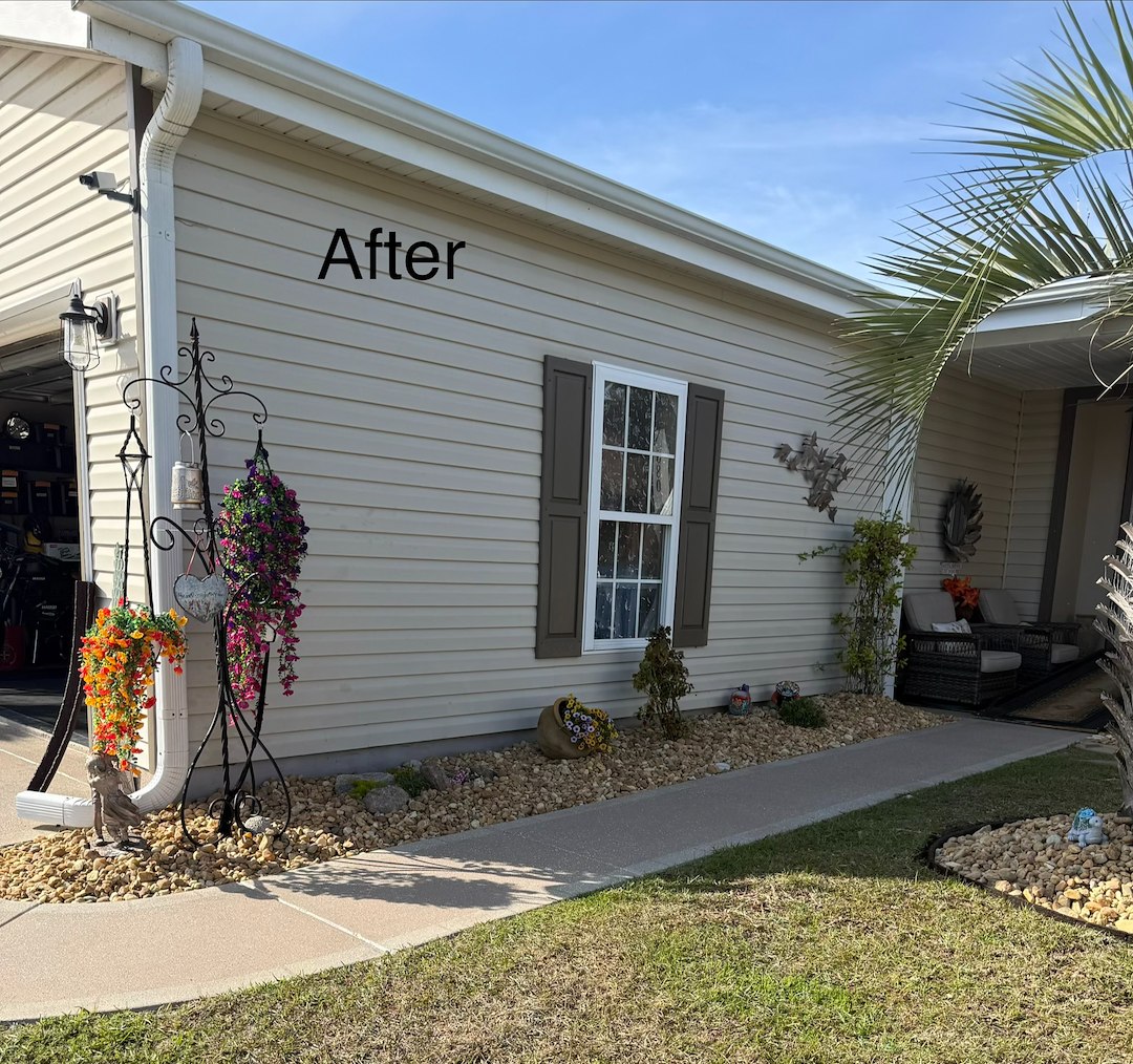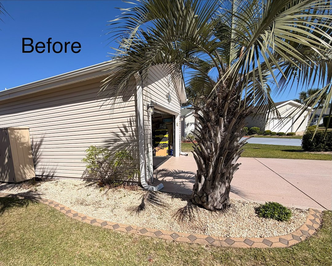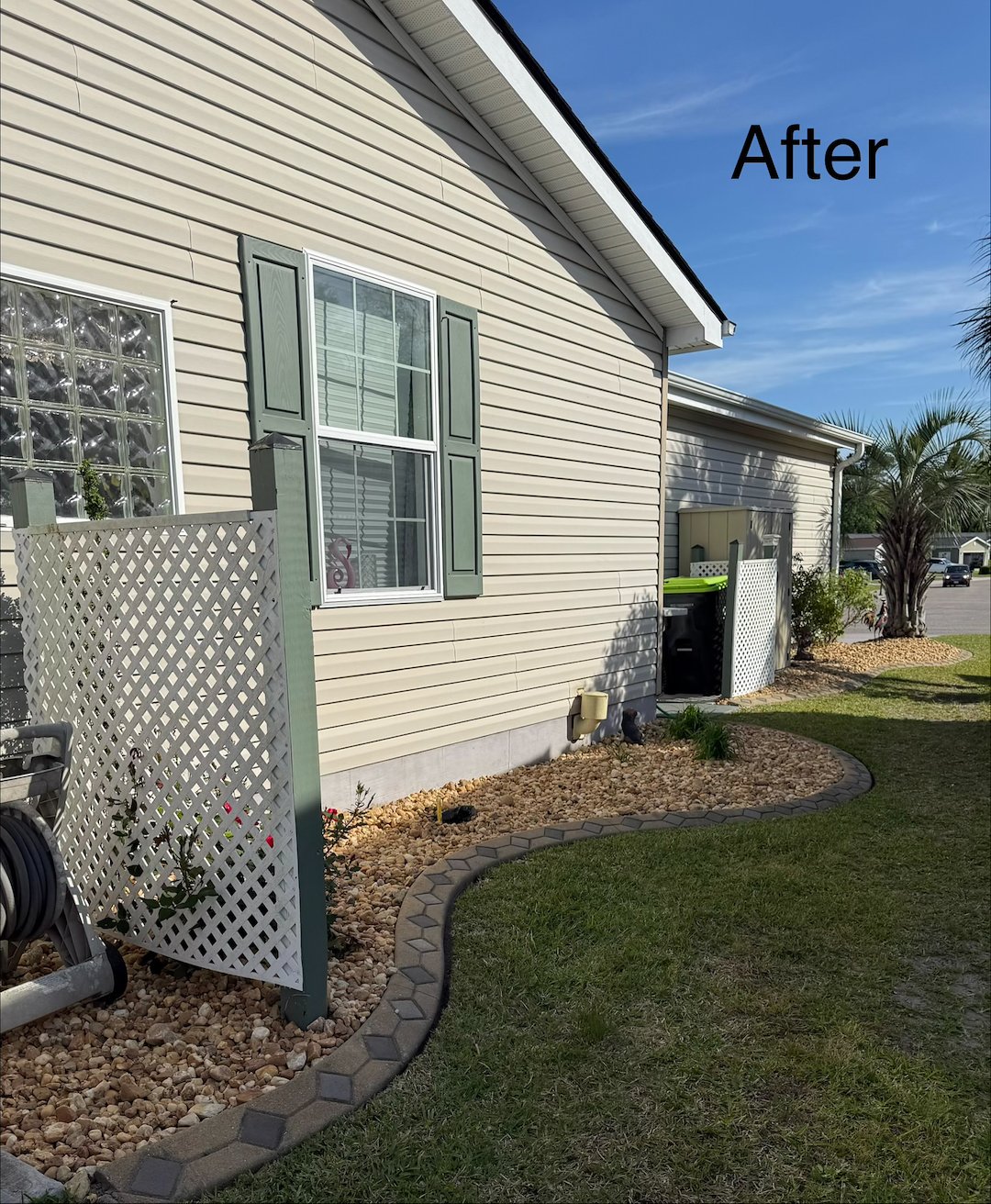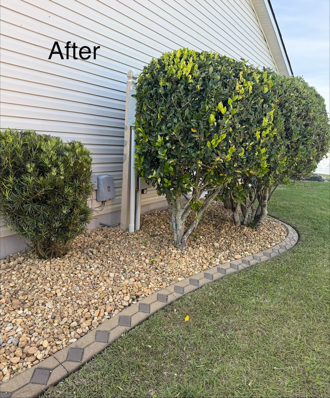 This job was completed around the second week of April 2026. The landscaping beds had existing small light colored rocks which were removed and replaced with darker and bigger rocks that matched the border of the landscaping beds. A few shrubs were relocated in the beds.
